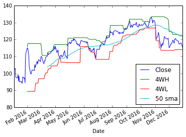 7. Plot 4WH, 4WL, 50 sma, and daily close.